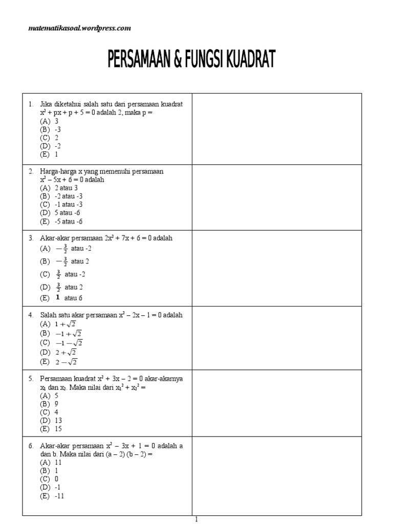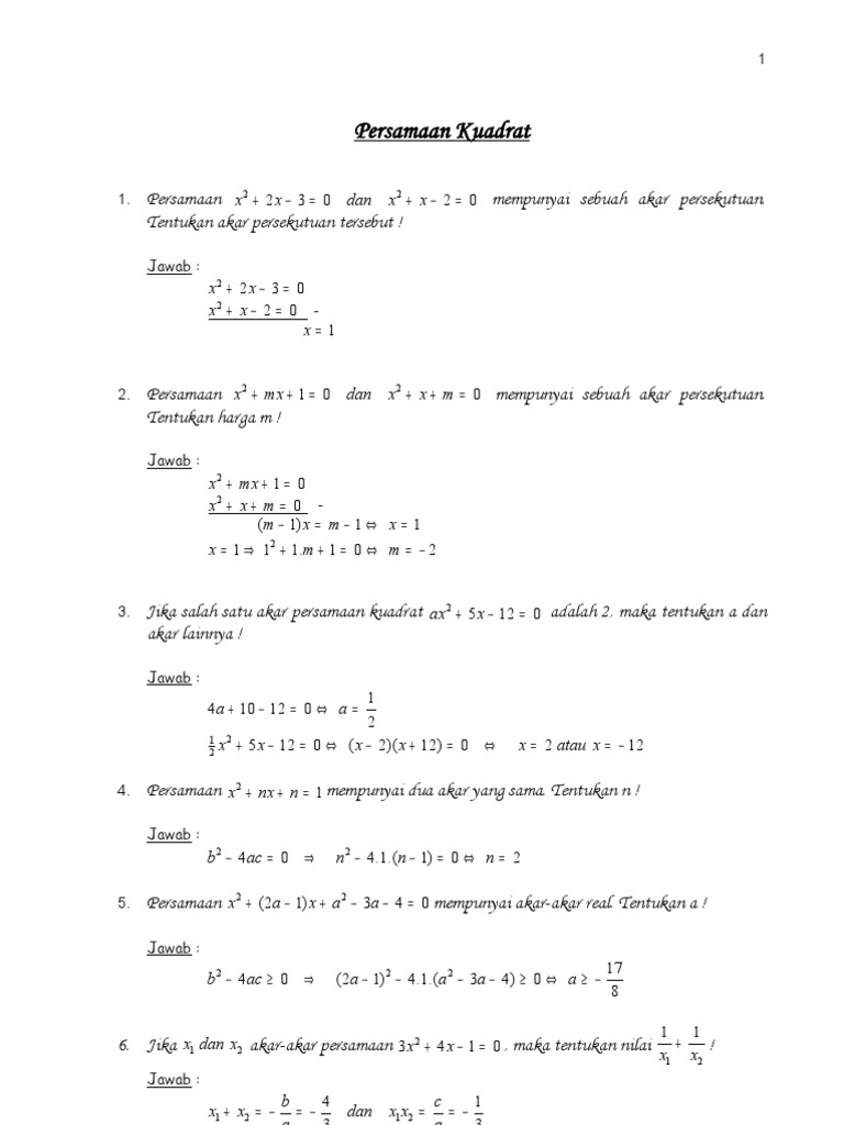 50 Latihan Dan Kunci Jawaban Persamaan Kuadrat