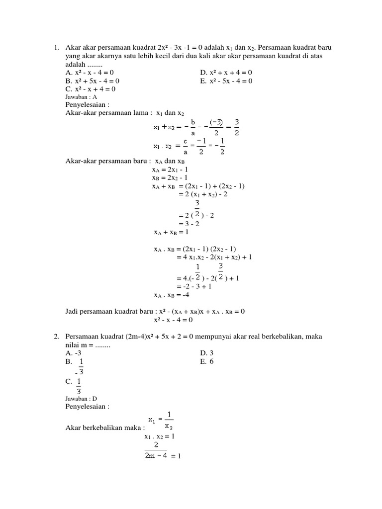Bab 1 Contoh Diberikan Persamaan Kuadrat 7x2 3x 4 0 Yang Akar Akarnya Dan Persamaan Kuadrat