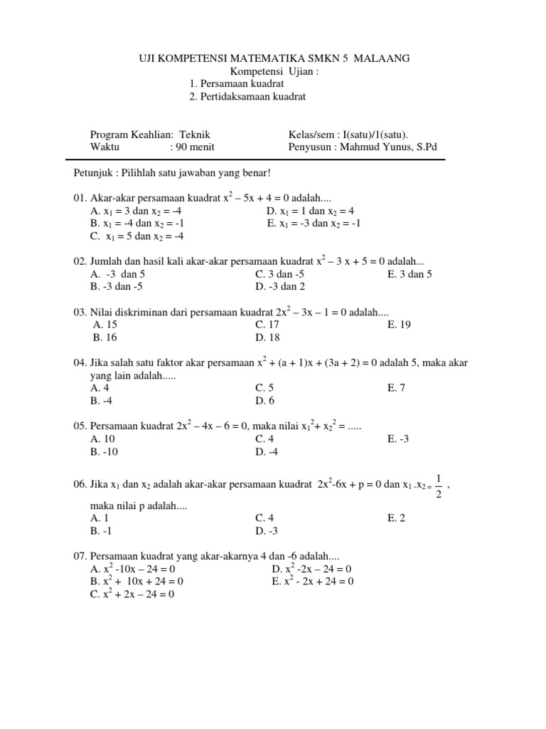 Contoh Soal Persamaan Kuadrat Pilihan Ganda Dan Jawaban Pembahasan