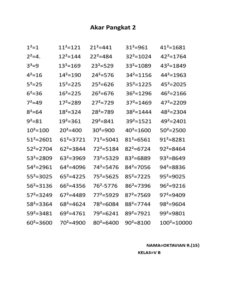 Tabel Akar Kuadrat Pangkat 2 Brainly Co Id