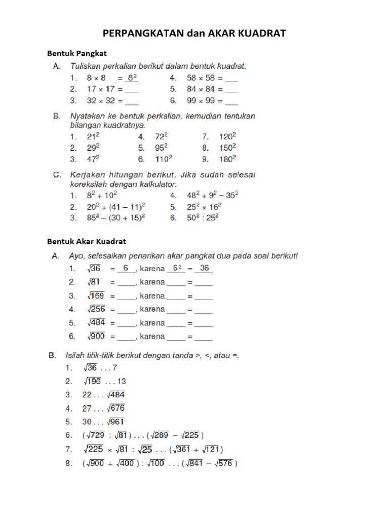 Soal Akar Pangkat 2 Kelas 5 Sd Dan Jawabannya Download File Guru