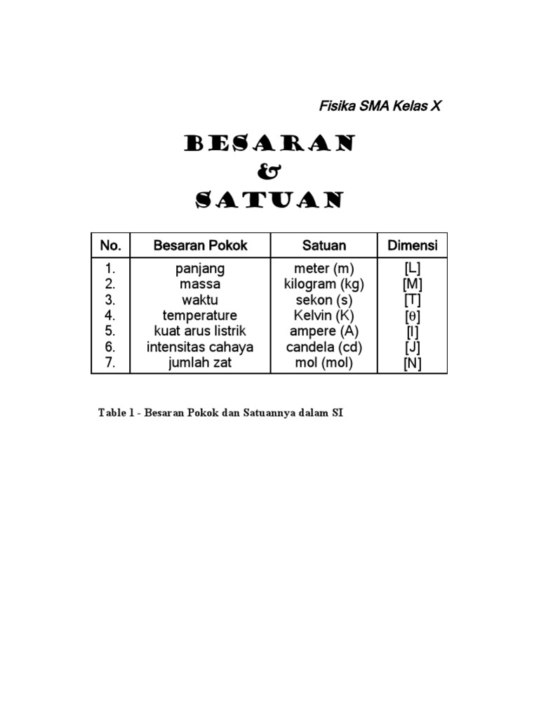 Besaran Satuan Table 1 Besaran Pokok Dan Satuannya Dalam Si