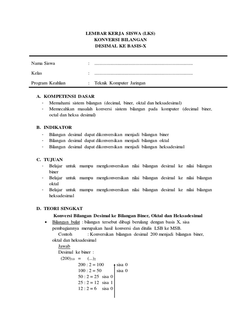 Lembar Kerja Siswa Lks Konversi Bilangan Desimal Ke Basis X