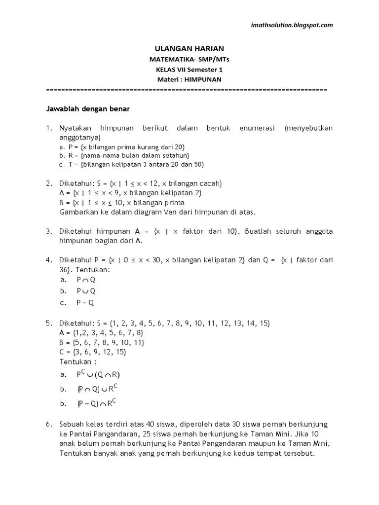 Ulangan Harian Matematika Smp Mts Kelas Vii Semester 1 Materi Himpunan