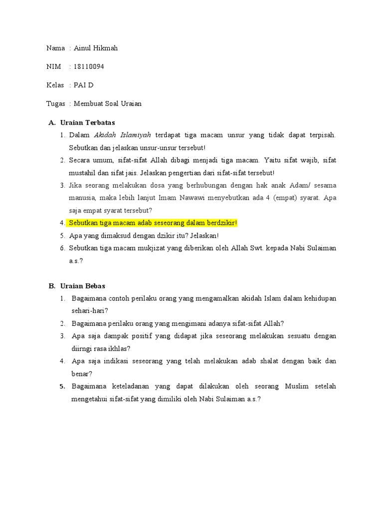Hot Contoh Soal Uraian Bebas Pai
