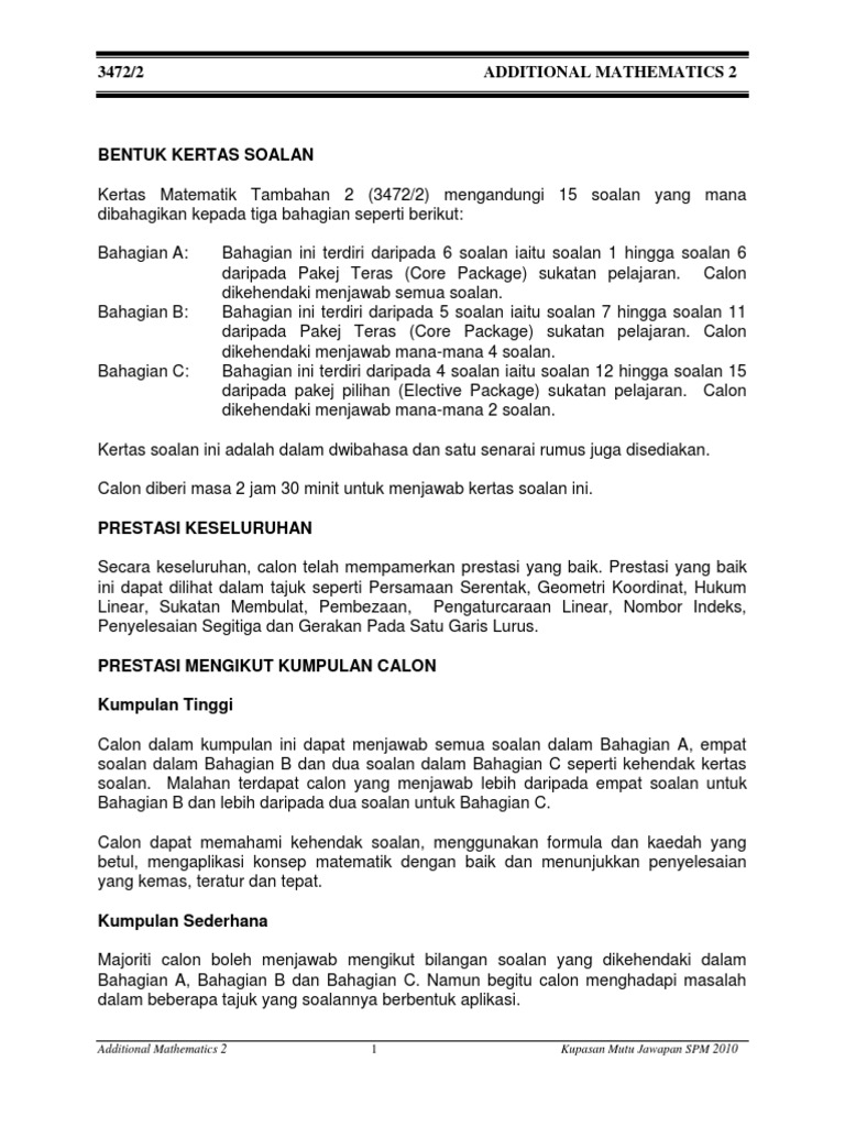 Additional Mathematics K2 Spm 2010 Kupasan Mutu Jawapan Calon