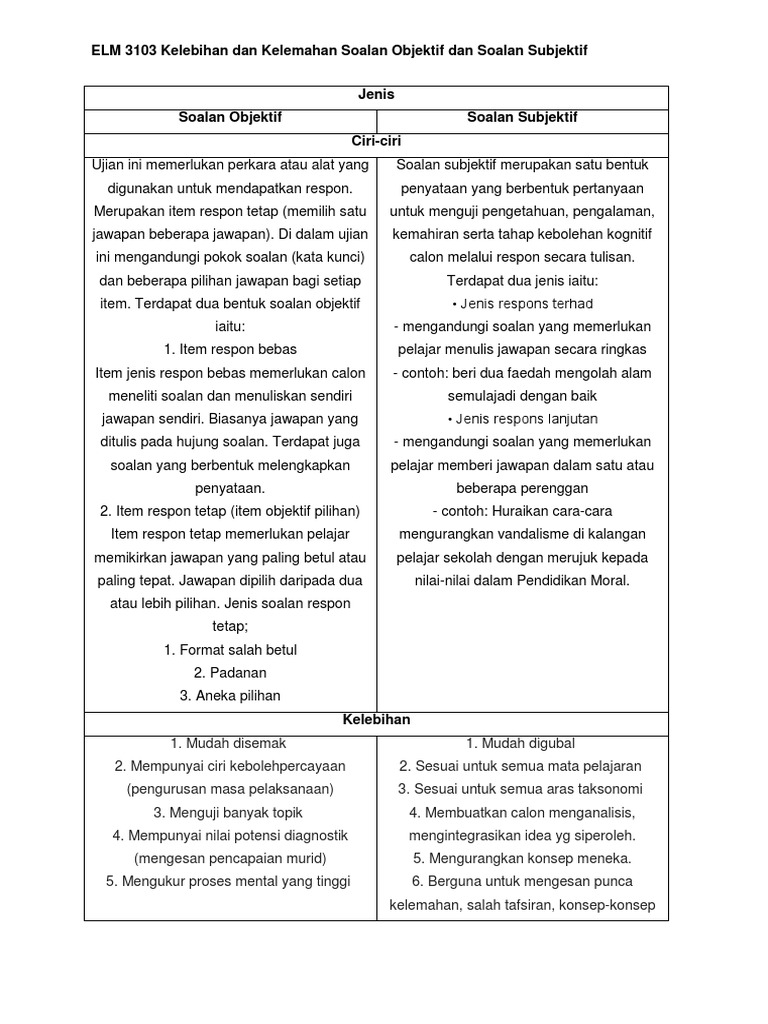 Kelebihan Dan Kelemahan Soalan Objektif Dan Soalan Subjektif